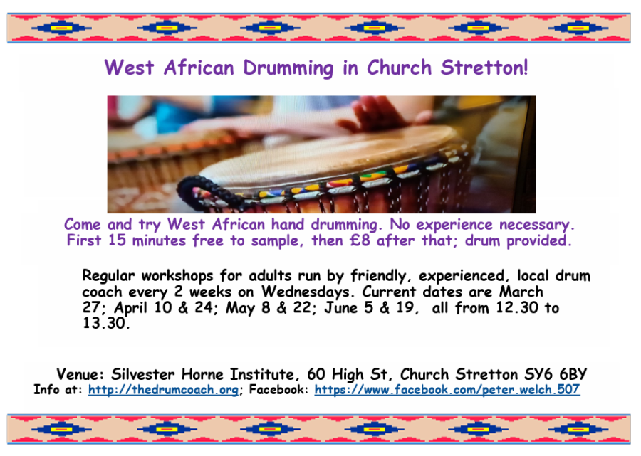 Come for a ‘taster’ of West African drumming for adult beginners in Church Stretton on alternate Wednesdays from midday. Free sample for 15 minutes at the Silvester Horne Institute, Ch Stretton. If you like it, stay on for the rest of the hour for £8 inc. drum hire. Book here: rhythms@thedrumcoach.org