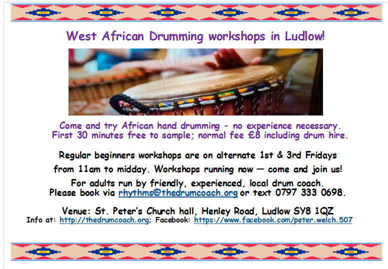 Have a 'taster' of West African drumming for adult beginners in Ludlow on alternate Fridays, from 11am to 1pm. Free sample for 15 minutes from 11.00. If you like it, stay on for the rest of the session for £8 inc. drum hire. Booking essential: rhythms@thedrumcoach.org